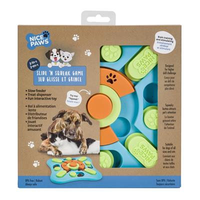 The Interactive Dog Puzzle Toy: Gralen Nice Paws Slide N Squeak – Level 2 intermediate level challenge requires pet to learn and combine multiple steps to retrieve the hidden treat.