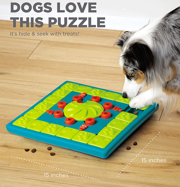 Place your dog’s favorite treats or kibble under the sliders in the outer tray and in the center treat compartments. Slide the center covers and outer tiles over the compartments to hide the treats. For an extra challenge, put the ridged orange locks in place to secure the green square tiles. Encourage your dog to seek the treats and let the games begin!