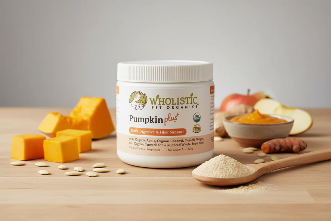 Every ingredient in Wholistic Pet Organics Organic Pumpkin Plus is sourced from certified organic whole foods in their natural form to support healthy digestion and balanced fiber intake. This formula focuses on gentle digestive support, microbiome nourishment, and stool consistency using plant-based fibers and functional botanicals found naturally in whole foods.